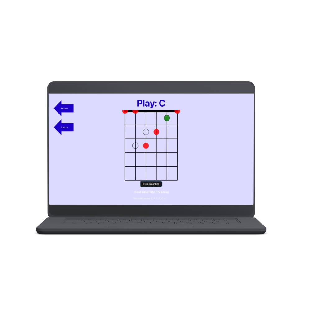 Chord Coach is a real-time guitar-learning web app built with React that helps users practice chords in a more interactive and intuitive way. Using the Web Audio API, and Essentia.js for audio analysis, it detects the chords you’re playing string-by-string and provides immediate feedback, turning practice into a guided, responsive experience. Beyond the technical build, the project emphasizes user-centered design, incorporating user research and thoughtful interface design to make practicing feel clear, engaging, and approachable for beginners.